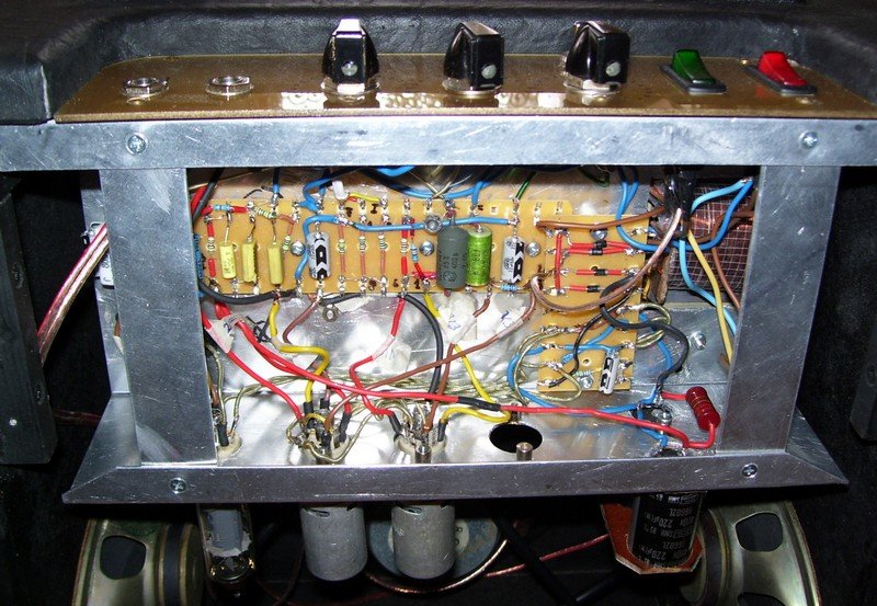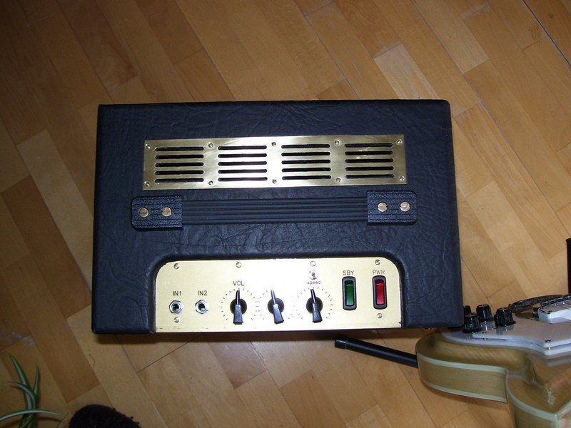 Bemutatom, no nem Balujevet, hanem az általam elké- szített VOX AC-4 SE kapcsolású klónomat. A trafókat is én tekertem és mint látjátok a kimenő (baloldalt) méretével sem spóroltam mert a min 6-7 cm2 helyett 8.8 cm2-re csináltam. Mind a kombó mind pedig annak hebegője (tremoló) szépen szól és normál esetben is leadja a kb. 4 Wattot, torzítva pedig még többet is. Igat az anódfeszt a kapcsolással ellentétben 270 Voltról 285 Voltra emeltem. Lusta voltam dupla menetet tekerni a hálózatira, ezért diódás egyenrángatást használtam. A feliratokat CNC-s marással a kezelőlapot pedig plexilap aranyozásával csináltam. Háttérben a szintén általam készített Rickenbacker 681-es klón látható amely e gitárgyár legdrágább modellje volt. Én ui. hobbyból modelleket, gitárokat és gityókütyüket csinálok....