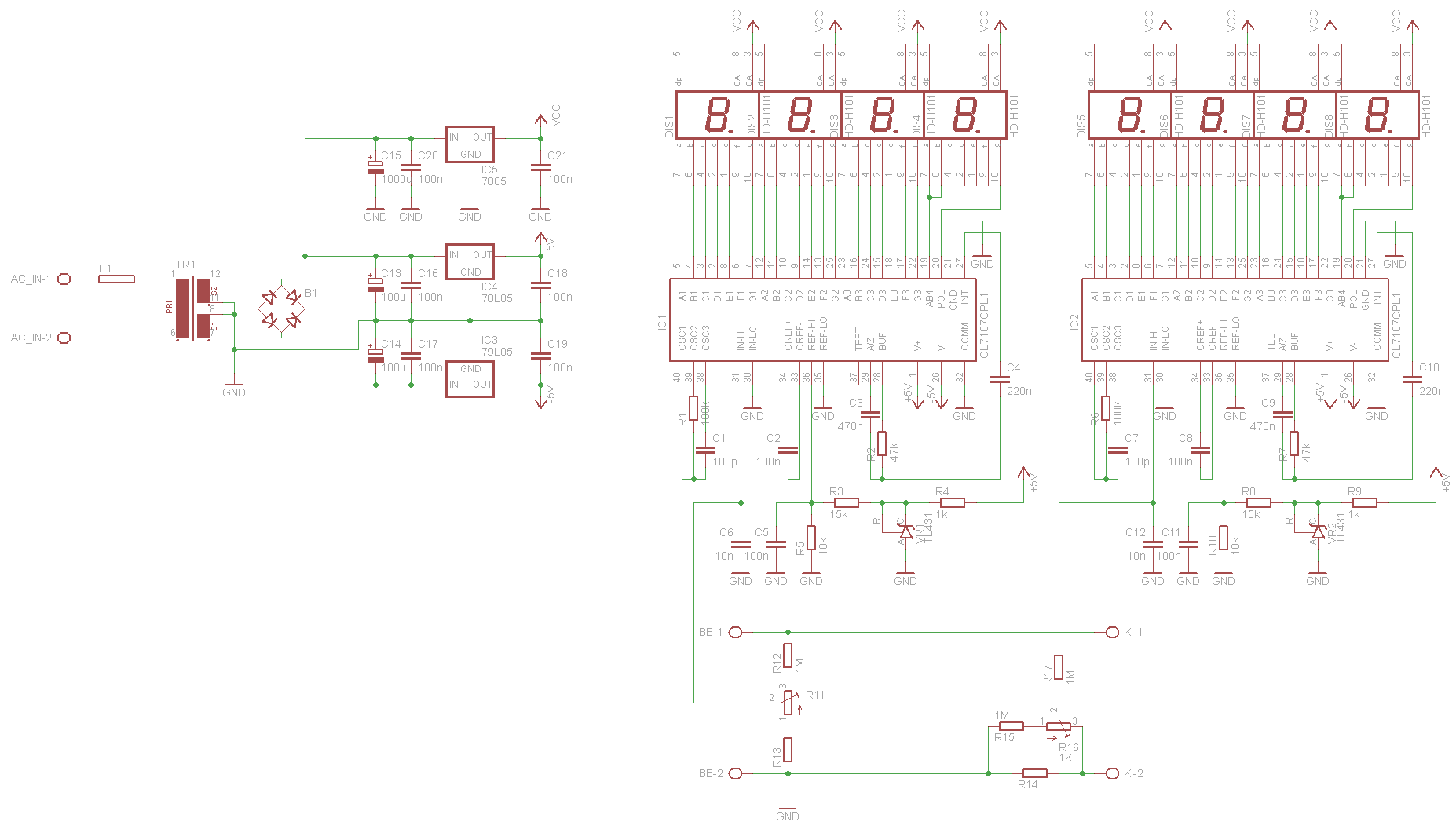 Nem kell két TL431, nyugodtan használhatod mindkét ICL7107-nél ugyan azt a referenciát! Tehát az egyik panelmérőnél hagyd meg a TL431-es részt és a másik A/D referencia-bemenetét egyszerűen kösd hozzá a másikhoz (36-os lábak).