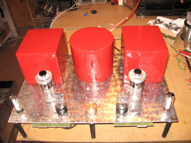Nekiestem és szétszedtem a PCL86 SE piccolomat, hogy bepácolom és lelakkozom a rétegelt lemez oldalait. A pácolás készen van. Addig a helyét a kicsit erősebb EL84 SE vette át
