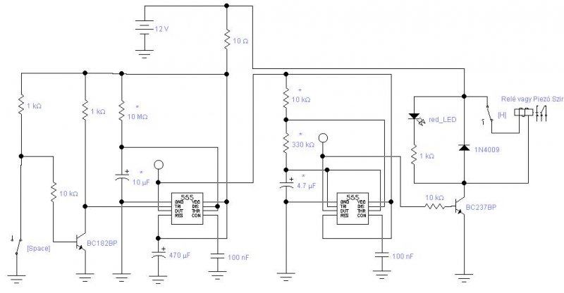 Szeretnék készíteni egy egyszerű kis riasztót. Alapötlet a következő: Ajtónyitásérzékelőként egy reed relét és egy mágnest használnék. Ha a mágnes eltávolodik a relétől akor a relében szakadás lesz, és ennek hatására kéne az hogy kb 2 percig szóljon egy sziréna. Úgy gondoltam, hogy 2db 555ös ICvel oldanám meg, egyik lenne a monostabil, ez adná a 2perces jelet, egy másik pedig az astabil, ez lenne a felelős azért, hogy a szirénát kb másodpercenként ki-be kapcsolgassa hogy ne folyamatos legyen a hang. Következők lennének a kérdéseim: -az 555öket tudom, hogy hogyan kössem be, és hogy milyen kondenzárot és ellenállás értékekkel, viszont azt nem tudom, hogy egy kapcsolásba feltétlenül szükséges az 555 mellé az a kondenzátor ami egyszerűen csak a Vcc-t és a gnd-t köti ösze? -A reed relénél hogy tudnám megoldani azt, hogy ha szakad akkor jelet küldjön a monostabil 555-nek? TTL kapuval gondoltam megoldani, de az csak 5 voltot bír, viszont a sziréna 12Voltról menne. Ezt hogy lehetne megoldani? -Végül a szirénát hogyan kössem az astabil 555höz? Kössem a tápját közvetlenül az ic kimenetére, vagy esetleg valamilyen tranzisztoros kapcsolással lenne jobb? Előre is köszi a válaszokat. Idézet: „egy kapcsolásba feltétlenül szükséges az 555 mellé az a kondenzátor ami egyszerűen csak a Vcc-t és a gnd-t köti ösze?” Igen, legalábbis célszerű. Idézet: „A reed relénél hogy tudnám megoldani azt, hogy ha szakad akkor jelet küldjön a monostabil 555-nek? TTL kapuval gondoltam megoldani, de az csak 5 voltot bír, viszont a sziréna 12Voltról menne. Ezt hogy lehetne megoldani?” Használj ellentétesen működő REED relét. (Ami akkor zár, amikor a mágnes eltávolodik.) Sokkal egyszerűbb! Idézet: „Végül a szirénát hogyan kössem az astabil 555höz? Kössem a tápját közvetlenül az ic kimenetére, vagy esetleg valamilyen tranzisztoros kapcsolással lenne jobb?” Az alapvetően a sziréna áramfelvételétől függ, de én mindenképpen egy tranzisztoros kicsatolást tennék oda.
