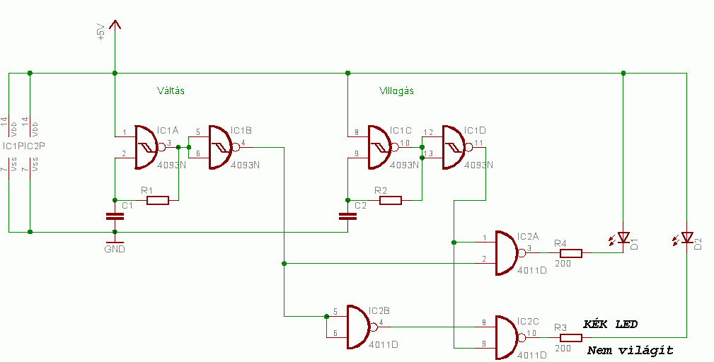 Az a porblémám, hogy van egy kapcsolási rajzom ami egy két LEDes vilogót hivatott előállítani, de a LEDek csak egy kis ideig villognak utána álló fényük lesz. Ez a kapcsolás ilyen vagy jó a kapcsolás és én rontottam el valamit?