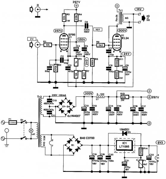 A kapcsolás maradhat ,vagy van jobb? Ha marad, a tápfesz menjen 400V-450V-ig (akkor megint soros kondik erdeje) és a hangszóró kimeneti csatlakozójáról vissza néhány Kohm az ECC81 katódjára? Az ECC81 gondolom elmegy 550V-ig mint az ECC83, de sejtem a szimmetriája ugyanolyan vacak, ezért ebből sem érdemes egyet használni a két oldalhoz.