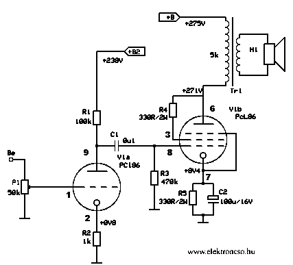 Az 50 µF-os kondi a föld felé legyen (elvileg lehetne az ellenállással párhuzamosan is, ki kell próbálni, hogy a hangot miként befolyásolja, akkor kisebb fesztűrésű is elég lenne oda), a 10 K lehet hogy jó is (a próbánál majd meg kell mérni a segédrácsfeszt és ha sok, akkor lehet növelni az ellenállást. ECC 83-al is meg lehet hajtani, akkor használj neki 820 ohmos (lehet 1 K-s is) katódellenállást, 47 K anód munkaellenállást, aminek a felső végén 350 V körüli tápot állíts be a szűrőtagja ellenállásával (1,5-2 mA között legyen a nyugalmi árama). A teljes hurokerősírést (érzékenységet) és a torzítatlan hangot, majd a visszacsatoló ellenállással (anódról anódra (100 K most)) be lehet lőni. A hálózati trafóval úgy kalkulálj, hogy tudjon leadni könnyedén 300 mA-t (2*320 V, 2*150 mA, vagy ha greatz-al egyenirányítasz akkor 1*320 V 300 mA). nem árt, ha 350 V-ig 10 V-onként leágazás is van. 320 V-ig jók a 450 V-os pufferkondik, afölött (350 V-ig) 500 V-osak kellenek.