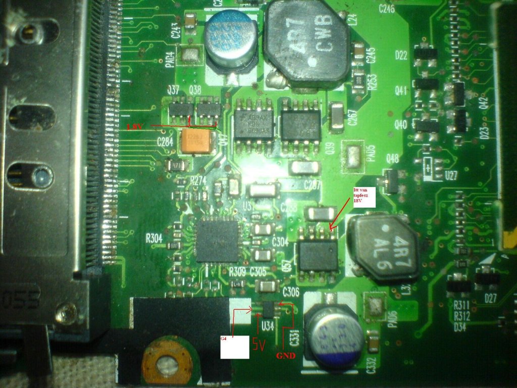 Lent a kondi mellett van egy olyan IC amin azt irja hogy G4 es mertem rajta 5 voltot,egyebb nincs a kepen feltuntettem hogy hol,es fenneb meg van 2 fet amelyikeken szerintem csak gate van,1.8V a gate-k ossze vannak kotve