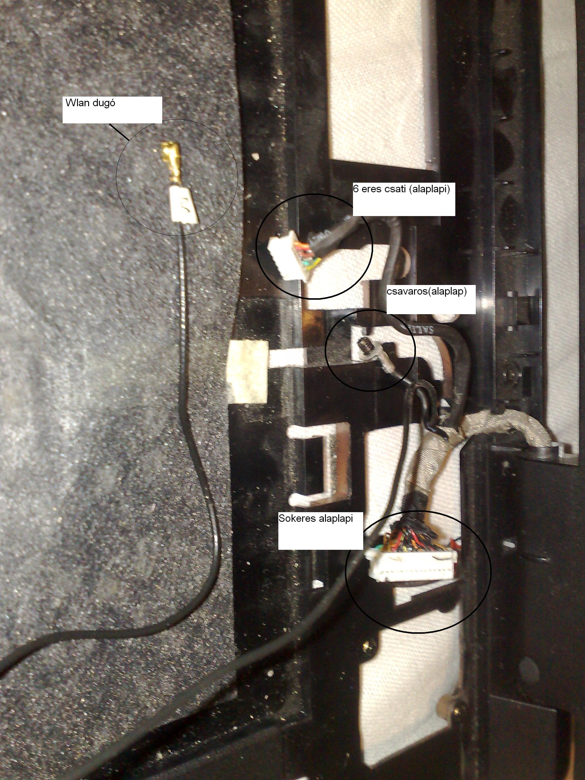Nos, sikerült végre időt szánnom rá. Az emlékeim némileg megvicceltek. Nem egy négyeres csati van rajta, hanem egy 6 eres, egy nagyon sokeres, egy kisdugó, ami a wlan karira ment(szükségtelen), valamint egy csavaros fekete, nem tudom, hova. Itt a képe. //gyanítom, hogy a nagyonsoklábú izé, az a monitorkimenettel van összefüggésben. Nekünk meg ugye egy bemenetet kellene szerkesztenünk, így szerintem csak a 6 eresre kell valamit kitalálni//