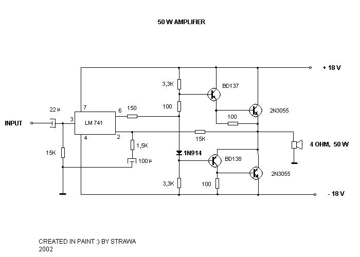 Nem működne +-50V-ról, mert a félvezetők nem bírják az ekkora tápfeszt. Pl.: a 2n3055 sem. De még ha kicserélgeted nagyobb feszültségű típusokra a munkapont beállító ellenállások értékein is kellene módosítani szerintem.