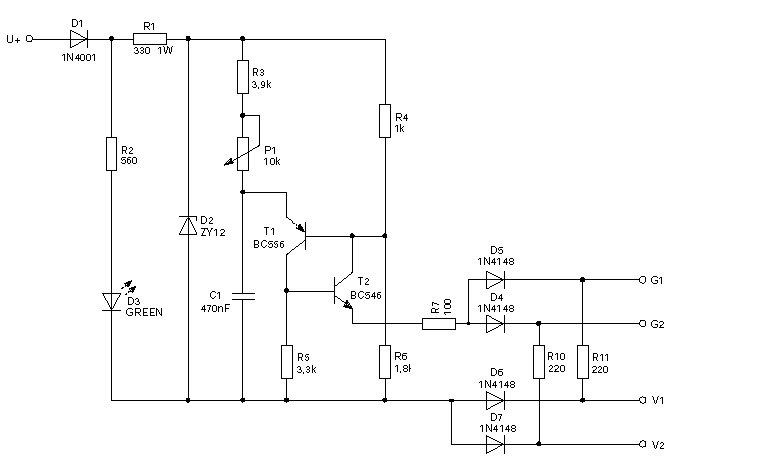 Tovább vizslattam a dolgot, mert a rajzot tanulmányozva, annak működnie kellett volna. És sajnálattal meg kell állapítanom, hogy az eredeti felállás is működőképes. Nem volt kedvem kotorni a tirisztorokat, a triac-ot meg fordítva kötöttem be. Már mint a Gate-katód-ot. (Csak a triac más világ, az gyújt negatív Gate feszültségre is...) Lehet ezt a hibát követted el Te is a TO220-as tokkal, mert "rendes" tirisztornál ez a hiba elég látványos lenne. Szóval a lényeg: - A PUT kapcsolásnál mikor a C1 feszültsége (T1 emittere) magasabb lesz, mint a T1 bázis feszültsége, a C1 kondit a tranyók kisüti az R7 ellenállásra. Így azon kb. 1..2usec hosszú, R4-R6 feszültségosztó által meghatározott nagyságú tűimpulzus keletkezik. - Ezt az impulzust differenciálja a C2-R8 tag. A kondi töltési idejét alapvetően az R10 határozza meg (Put-dióda-tirisztort elhanyagolva), ez kb. 22usec. Tehát az 1-2usec impulzust simán átviszi. A kondi kisütési idejét az R8 határozza meg, mely 150usec alatt végbemehet. Ez bőven elegendő a 10msec félperiódus legkisebb gyújtásszögéhez mérten is. Szóval a 100nF kapacitásával nincs baj. - A kapcsolás leglényegesebb része, a D4..D7 dióda. Alapvetően a D6/D7 egyenirányítja a PUT áramkör részére a váltófeszültséget, így a zéner dióda kétutas jelet kap. Viszont ezek a diódák, nem csak egyenirányítanak, hanem "kommutálják" is a tirisztor vezérlését. Egy tirisztor, csak akkor vezethet, ha az anód feszültsége pozitív. Ilyenkor kell a pozitív gyújtóimpulzust, a Gate-re vezetni. Amikor a TI1 tirisztor anódja pozitív akkor a hozzátartozó katód negatív (V1). Így a D6 vezetni fog és az áramkör GND pontja ennél csak 700mV-al magasabb lesz mint a tirisztor katódja. Tekintve, hogy a gyújtóimpulzus a GND ponthoz mérten állítjuk elő, és ennek feszültsége pozitív, a D5 diódán keresztül a gyújtóimpulzus a Gate-ra kerülhet. Közben a TI2 tirisztor katódja (V2) plusz periódusban van, így a D7 dióda zárva van. Mivel a TI2 Gate is ezen a plusz potenciálon van, a D4 dióda szintén ez idő alatt zárva van. Így a gyújtóimpulzus, nem kerül ki a TI2 Gate-re. A működést így megértve, látható, hogy a differenciáló tagokra semmi szükség, ezek nélkül is működik az áramkör vidáman, mint ahogy a próba is igazolta. (rajz mellékelve) A lényeg, a diódák kommutációja. A 100ohm itt, csak korlátozza a PUT felől érkező gyújtóáram nagyságát. Mind ez mellett fenntartom a véleményem, hogy a trafós megoldás a legtisztességesebb. Így nem kell kommutálni, és a PUT áramkör is olyan feszültségszinthez csatlakozik amilyenre csak akar, mert a trafó biztosítja a kellő galvanikus elválasztást. üdv! proli007