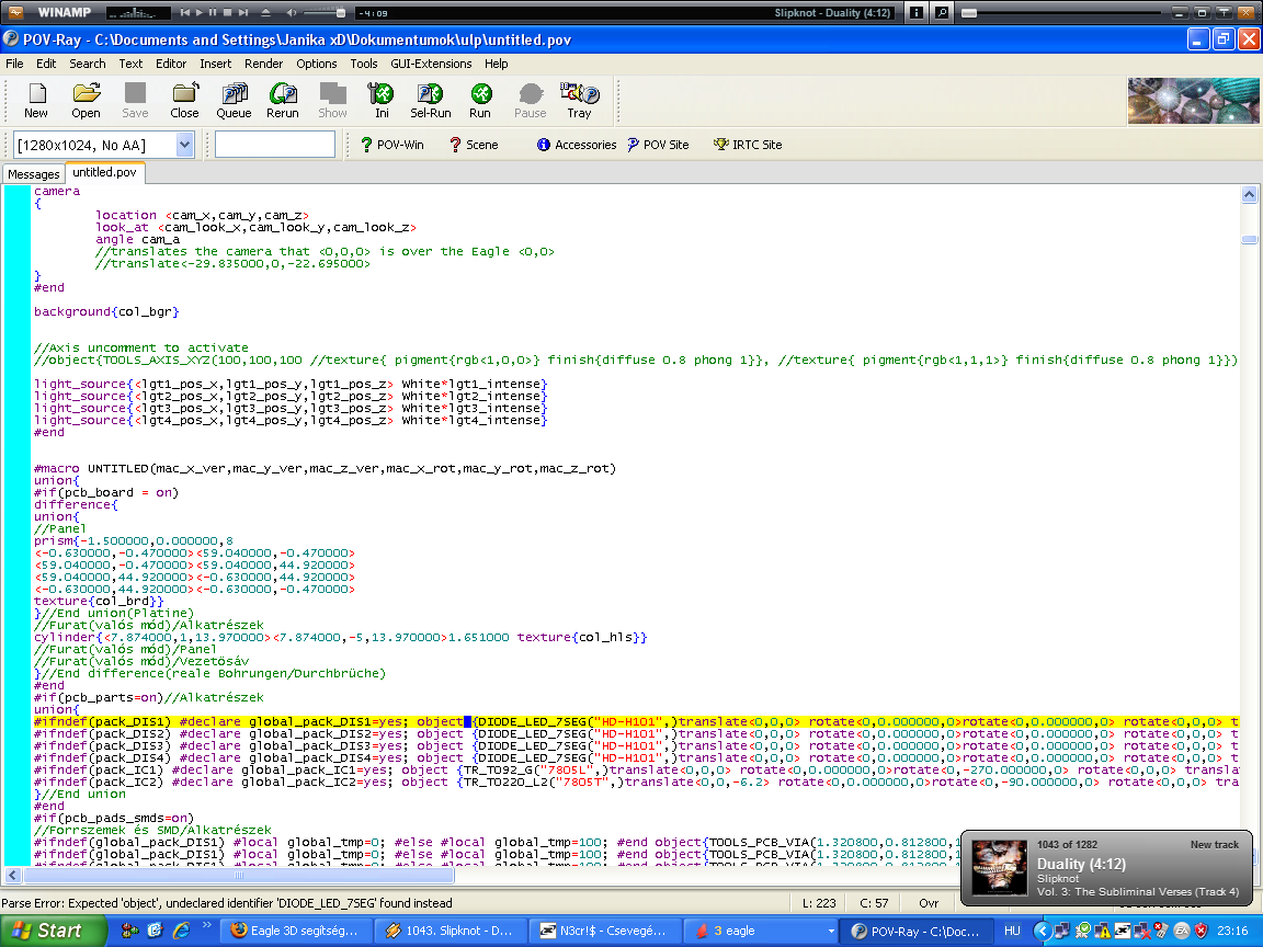 A POV-Ray ablakának bal alsó sarkába írja ki hogy mi baja van az adott sorral. Ha ezt látnánk akkor talán többet tudnánk mondani.