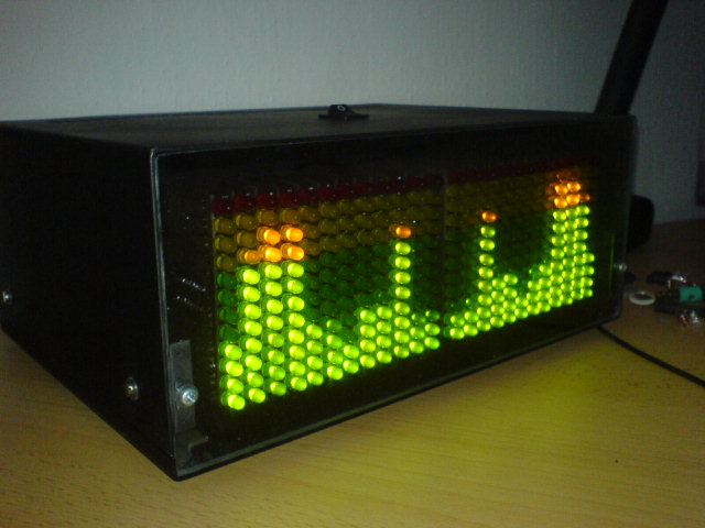 Aztan a LED oszlopok (-) pontjait osszekotod , lessz anyi minusz kivezetes ahany oszlop van. ezeket egy egy tranzistor kollektorara kotod , az emitterek a foldre vannak kotve ( a minuszra). ezeket a tranzisztorokat egy lepteto regiszter jelevel kapcsolgatod ugy hogy sorba gyujtanak be az oszlopok.A leptetoregisztert egy tizes szamlalorol hajtod meg 4 biten ugyanavval a leptetoregiszterbol jovo ( vagy 1 a 10 -bol dekodolobol) jellel kapcsolgatod a minden oszlophoz jaro szurot (kb egy oktav savszelessegu 10 oszlopnal mintha ) egy egy MOS analog-dogitalis "relen" keresztul ...MMC4016 ,MMc4052, 4053 mindegyik masmilyen de ugyanazt lehet csinalni veluk , kapcsolni az audio jelet a szurokrol a LED driverre olyan UAA xxxx tipusu (a szurok lehetnek az EQ szuroi) en epitettem egy oszcoloszlopot 16x16 LED -el , a convertorom tudna 8 bitet de 256x256 LED az mar sok.Nem UAAxxx - val hanem egy 8 bites ADC es 1 a 16- bol dekodoloval Az oszlop kapcsolo jellel vezerelek egy feszultsegvezerelt oszcilatort es woblernek is lehet hasznalni .Egy elenalas lancon szep logaritmikus jelet nyerek az oszcilator szamara ...csak keves a 16 x 16 LED , a 4 bites kijelzes.