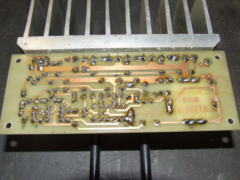 Az említett ellenállások nem kellenek. Eredetileg két féle koncepció keringet, és az egyik szerint voltak bent 10 ohmos bázisellenállások. De aztán beszéltem a szerzővel, és azt mondta teljesen fölösleges, bőven elég az emitterek szimetrizáló 0,68 ohmja. Így ezek rövidzárak. Mellékelem az én rajzomat, és egy fotót is a mintapéldányról. Fontos!! a képen lévő bordaméret nem elég, ettől jóval nagyobb hűtésről kell gondoskodni. Mikor én teszteltem, akkor vízbe raktam a bordát, mert ez volt akkor a legegyszerűbb megoldás. Még utólag beszúrtam egy kis kéziratot, ami segít a műszerosztók meghatározásában. Alkotó