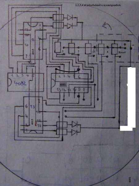 Ez Bővebben: Link alapján mondom a bekötéseket. -8-as és 6-os lábak a földelésre. -5-ös és 9-es lábak a tápfeszültségre -1-es és 13-as lábak a LEDekre(ellenállásokon keresztül) -2-es és 12-es lábak a 4082-es IC bemenetére Ezenkívül mind a 4 IC 7-es lábaik a földelésre,14-es lábaik a tápfeszültségre. -3-as és 11-es lábakat összekötve.Kipróbáltam úgy is hogy ezt a kettőst kötöttem a tápra,a másikat a földre. -4-es és 10-es lábak összekötve.Kipróbáltam úgy is hogy ezt a kettőst kötöttem a tápra,a másikat a földre. Eredmény:2 LED világít,a másik kettő nem.A kapcsolókra pedig nagy ívben xarik a kapcsolás,hiába nyomogatom őket,semmi változás. Mind1.Azért köszönöm a segítségeket.Elkönyvelem úgy hogy én rontottam el valamit valahol,de hogy mit...?! további kellemes napot