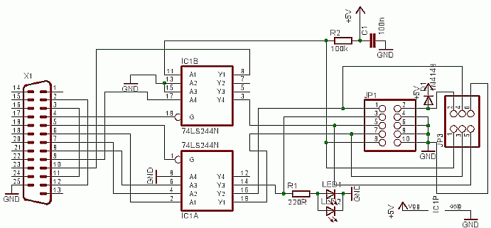 Egy észrevétel: 74LS244-ből miért tettél bele kettőt? A kapcsolási rajzon úgy van, hogy IC1A, és IC1B, ami ugyanazt az IC-t jelenti, csupán a jobb átláthatóság miatt két részletben ábrázolják.