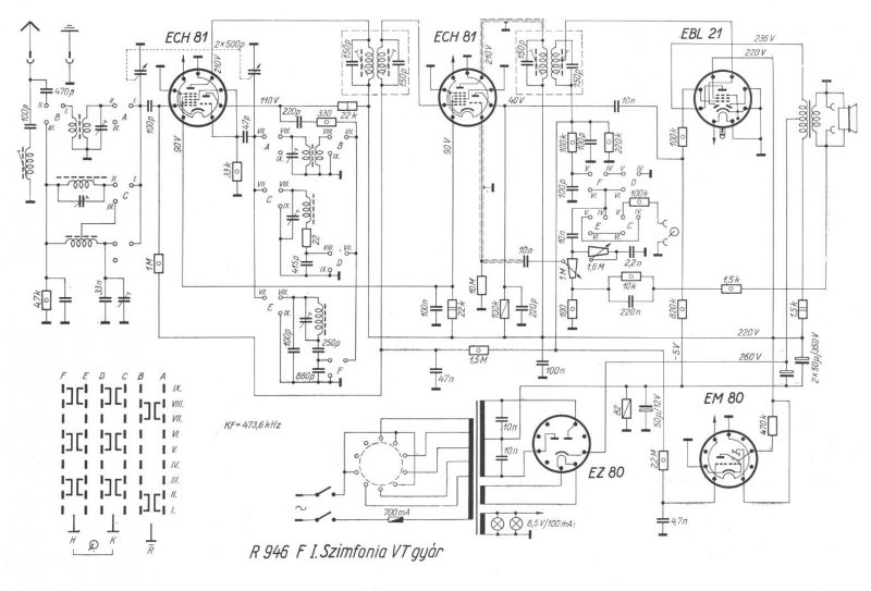 Szerintem Zoli is ugyanazt írja. Először is meg kell vizsgálni, hangfrekisen megy-e. Ha igen, akkor meg kell nézni, rádióüzemben melyik egységeknek mikor kell működni. A KF erősítő mindenképpen megy, ahogy a keverőcső is. Az ECH triódája csak AM, az ECC85 (és a keverődoboz) csak FM üzemben kap tápfeszt. A HF jel 3 féle forrásból származhat. Az FM, és AM jelet az URH nyomógonb csúszkája választja ki ( kiengedett helyzet: AM demodulátor, benyomott FM demodulátor). Az innen leszedett, FM, vagy AM jelet választja el a PU nyomógomb a külső DIN csatlakozóra érkező jeltől. A tápfeszültségeket az RF résznek is az URH csúszka kapcsolja.
