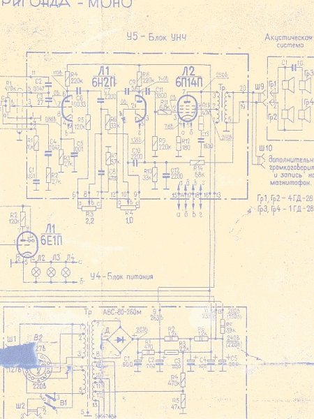Itt küldöm a ruszki (egyébként Lettországban, Rigában készült) RIGONDA rádió végfokának rajzát. A "lúhoz értők" több érdekességet találhatnak benne. Pl. a kb 20 Volt pozitív feszre tett fűtésközepet a 6N2P (kb. ECC83) előcső számára. Nekem ebben a rádióban az volt a kellemes, hogy annak hangolását az óriási hangológomb segítségével a lábujjammal is végezhettem a lányok gyömködése közben....