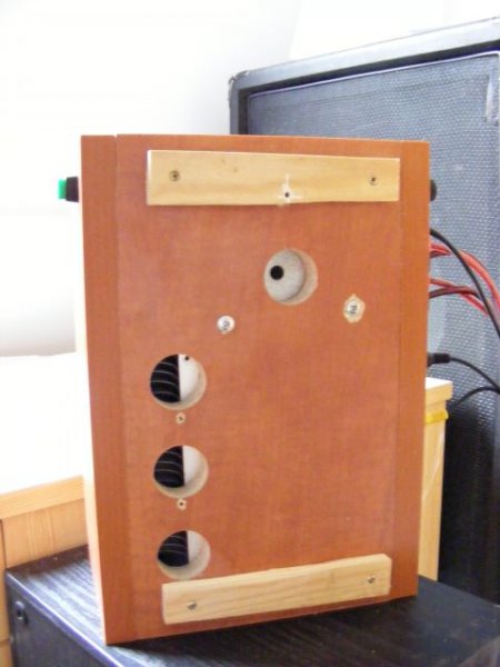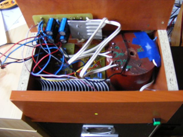 Sziasztok! Kb. két hete dobtam össze ezt az erősítőt. Volt egy torroidom és egy hűtőbordám, a végfok paneleket 90%-ban Skori tervei alapján készítettem, majd az egészet bútorlapból készült dobozba építettem. A hangjával meg vagyok elégedve, egyetlen hibája, hogy árnyékolás hiányában a lámpák kapcsolásának zaját is felerősíti. Az előlapon lévő LED kétszínű, kb. 1,5 A szekunder oldali áramfelvétel fölött pirosra vált.