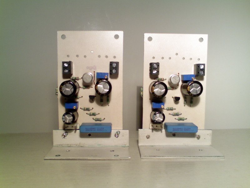 Összeraktam az egyik oldalt, potik közép állásban, majd rákapcsoltam a 30V-os tápot, Rövidre zárt bemenettel. A pozitív ágba kötött ampermérő kitért majd szép lassan beállt 0,8A -re. A plusz és a két végtranzisztor közös pontja között mértem a feszültséget / kondi előtt/. Beállítottam a 15V-os tápközepet majd az 1A-es nyugalmi áramot. Ezután rövidrezárt bemenettel műterhelést raktam rá ( 10 ohm 5W-os ellenállást). Ismét beállítottam a tápközepet és a nyugalmi áramot csakhogy a kondim és a terhelésem melegedett az előbbi el is pukkant.