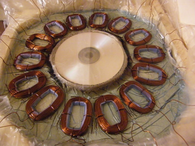 Öntés elött a tekercsrögzitő drotokat el kell távolitani,helyette tekercs szalagot használj,vagy valamilyen vékonyabb zsinort.És ami nagyon fontos,készits valamilyen vastagabb fedelet,minnél simább,annál jobb, amit öntés után rányomsz a tekercstömbre,(természetesen ott marad megkötés utánig)ezzel is értékes mm.-ket ,,,faraghatsz,,, le a tekercstömb vastagságábol.