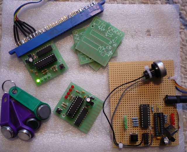 Nehany hete elkeszult a iButton programozhato interfesz. ATTiny2313 dolgozik benne. Roviden: Negy OC kimenettel rendelkezik - ULN2803A v. 2003A. Miden kimenethez lehet programozni egy kulcsot. Ket modban dolgozik: programozo es felhasznaloi. Kulcsokat torolni is lehet. Prog. modban a megfelelo portot villogo LED jelzi, nyomogombbal leptetheto. Felhasznalo modban csak kulcs olvasasnal jelzi LEDdel a megfelelo portot.Stb.. Jatekgepekhez keszult. A kepen lathato probapanelon, majd legyartatva/osszerakva, ipari csatlakozon is.