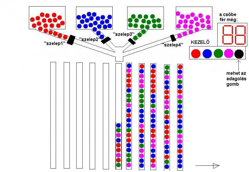 Van egy érdekes feladatom, amit nem igazán tudok megoldani. A feladat megértéséhez csináltam egy "szaki" rajzot. A programnak egy golyóadagoló automatát kéne müködtetnie, a lényege pedig az, hogy jelen estben van 4 szín. Ezeket a szineket tetszőleges mennyiségben tetszőleges sorrendbe állithatjuk, addig, amig a cső nem lesz tele. Amikor már megadtuk a golyók sorrendjét a szingombok nyomogatásával, akkor megnyomjuk az adagolás gombot és a szerkezet elkezdi beletölteni a golyókat a csőbe. Próbálkoztam már sok megoldással, de túlon túl bonyolultak lettek és a legföbb baj az lett, hogy a variáció száma nagyon nagy és ha pl. egy csőbe 50 golyó is elférne, akkor minimum 200 számlálót kéne beleraknom a programban - és ha még több szint is akarnék alkalmazni, akkor még több kell. Tehát ha valaki tudna erre a feladatra valamiféle tanácsot adni, akkor annak nagyon örülnék. Előre is köszi a válaszokat minden kedves segítőtársnak, Üdv.