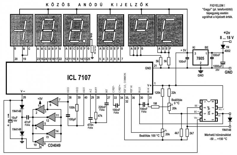 A CD4049 és a balra mellette levő pár alkatrész biztosítja a minusz 5 voltot az ICL7107 26-os lábának.