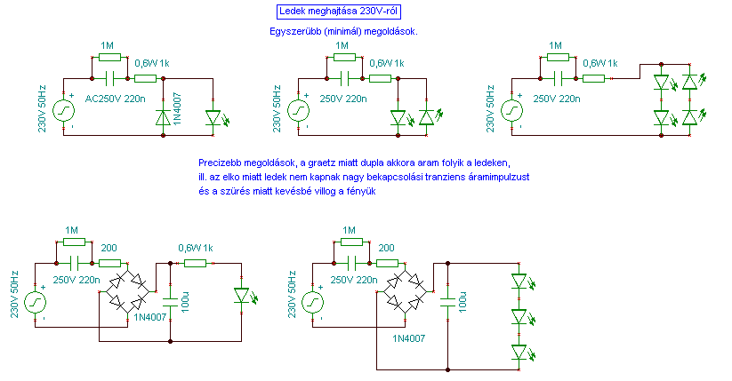 Na mind1, ez már részletkérdés, gondolom típustól is függ valamennyire. Van egy másik kapcsolási rajzom, azt is még itt találtam a fórumon. Szintén alsó sor, a kondit elírták, az szerintem 600V. Csak azt nem értem, hogy az a 220n-os kondi miért kell oda. Igazából az lenne a legjobb, hogy sorba bekötni a LEDeket, annyit amennyit csak lehet. Akkor ellenállás se kellene ugye? Ha több LEDet rakok bele, akkor min kell változtatni? Van egy olyan érzésem, hogy a 100 mikros kondit kell növelni, csak azt nem tudom, hogy mennyire.