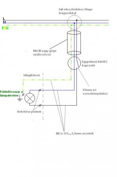 Értelek! igazából az én elképzelésem aztán majd montok rá valamit: meg keresem az elsö dobozt és egy-egy 3-as sorkapocsal ki veszem a fázis nullát és a földelést. a nullát telibe kötöm a lámpába a kapcsoloba pedig be kötöm a fázist és onnan visszem tovább a lámpába. ezzel szakítva a fázist. és a Kapcsoloba kötöm a földelést a megadot helyre!