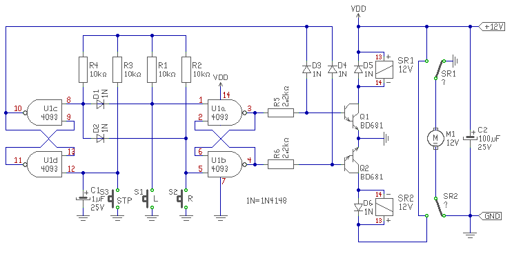 Helló! Jobban jártál proli007 rajzával két okból is .Mert egyszerűbb mivel én a prell mentesítést egy CD 4093 három kapujával oldottam meg. Plusz egy tranyó a bekacsolási alap helyzet. Én a reléket a 2-es és 7-es lábról hajtottam meg és a 10 lábról áll alap helyzetbe.Így a következő képen működik: Az első gomb nyomásra balra forog következő nyomásra megáll következőre jobbra forog majd megáll és kezdődik előröl. Nekem ez a kapcsolás a toló kapumat vezérli némi kiegészítéssel. A másik ok ,hogy a proli007-nek van egy rajzoló programja én meg vastag filccel rajzlapra csináltam meg, hát láttam már szebbet is.