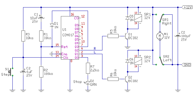 Ha 4017-el oldjuk meg, akkor az a különbség, hogy egy nyomógombbal lehet vezérelni, de csak sorrendben. (jobbra forog - balra forog - áll) Természetesen a stopp nyomógomb külön is lehet.