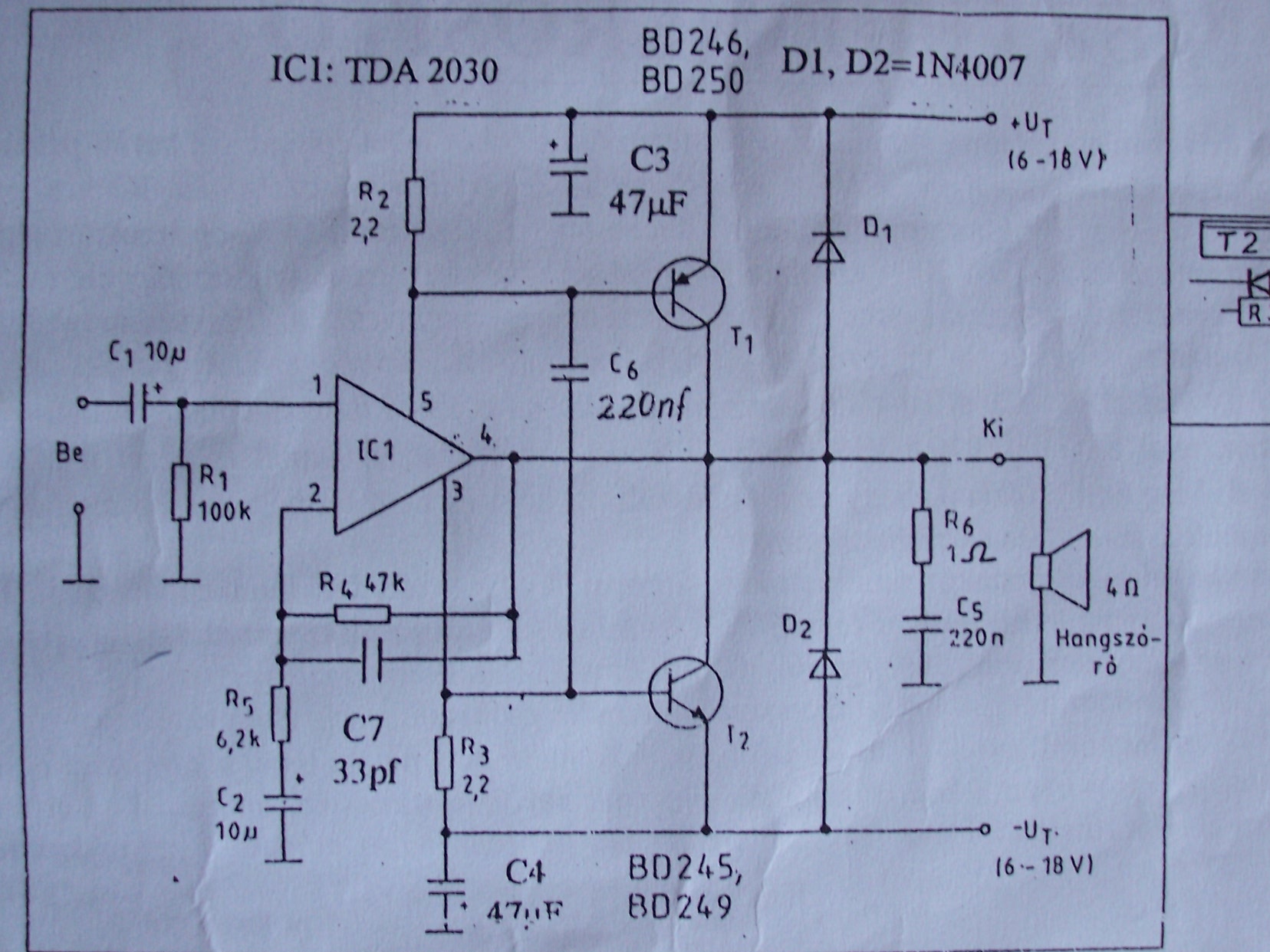 Van nekem egy erősítő ami ezt az IC-t használja. Egy egységcsomagból építettem mégTranzisztorok segítsével képes 40 Wattot kiprréselni magából. A gondom az lenne, ha nagyon felhangosítom, elkezd recsegni, zörögni, vagy hogy mondják. Egyébként két 50 Wattos, 8ohm-os saját gyártmányú hangfalat használok amiben Somogyi Electronic által gyártott hangszórók találhatóak. A tápegység és végfok kapcs. rajz mellékelve: