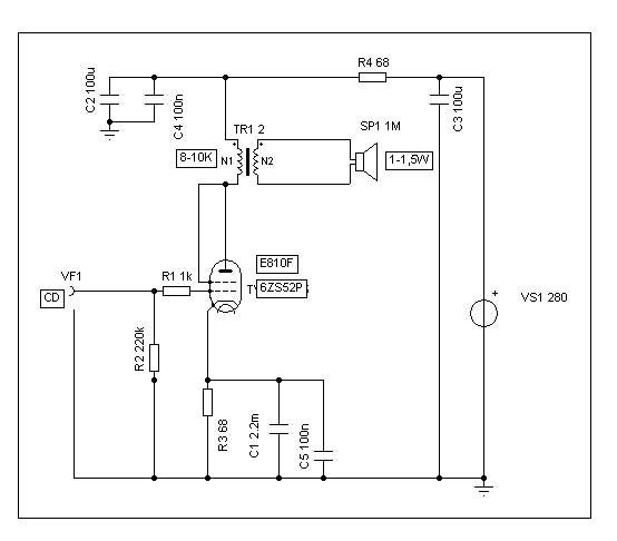 Egyszerű erősítők kedvelőinek figyelmébe ajánlom a következő SE kapcsolást . Egyetlen csővel kivitelezve , trióda módban , kb 1/2 órai munka és már szól is .