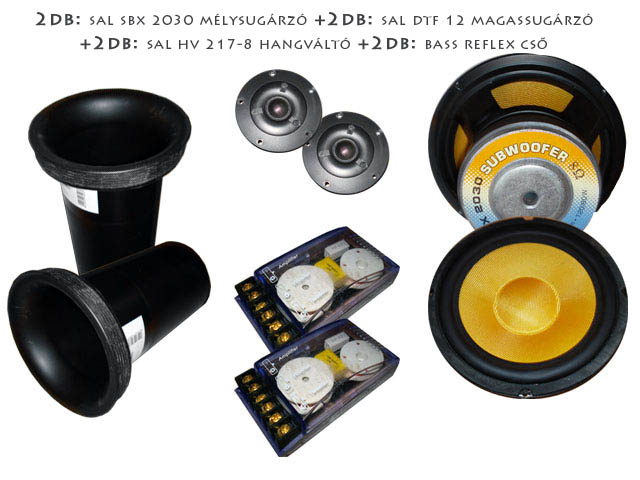 2DB sal sbx 2030 mélynyomo, 2DB sal dtf 12 magassugárzó, 2DB sal hv 217-8 hangváltó, és 2 DB 100mm-es reflex cső.
