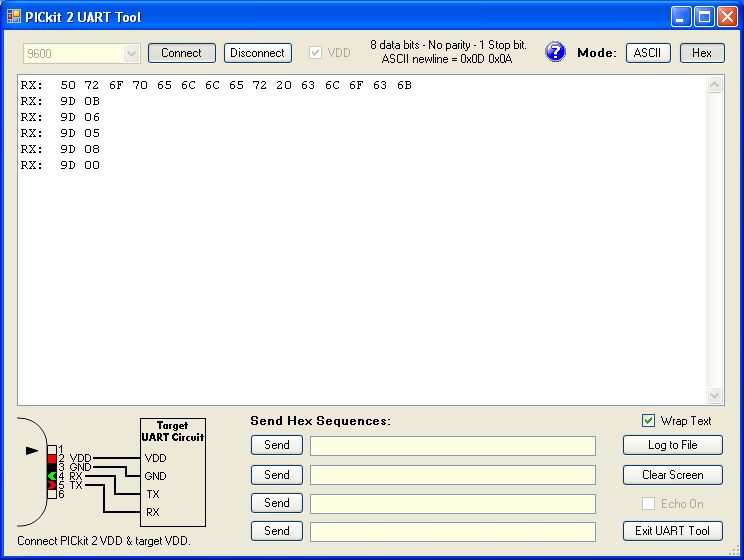 Már a kezdet kezdetén felmerült a probléma, többször írtam már róla. A bázist úgy építettem meg, hogy az uart RX lábat, az RB1-et felszabadítottam - átraktam az RB0-ra. Így az uart felhasználhatóvá vált. A programot módosítottam, a vett címet és parancs kódját az uart segítségével leküldi. Az uart kimenetét PicKit2 soros vonali módjában használva már meg is jelent a kívánt információ. A mellékelt képen jól látszik a cím és a parancs kódja. Az első sor pedig a bejelentkező szöveg "Propeller clock" A bázis így alkalmassá tehető az RC5 infra adatok megjelenítésére is. Szerintem a videon az első két digiten a cím a második kettőn a parancs kódja jelenik meg.... Sziasztok