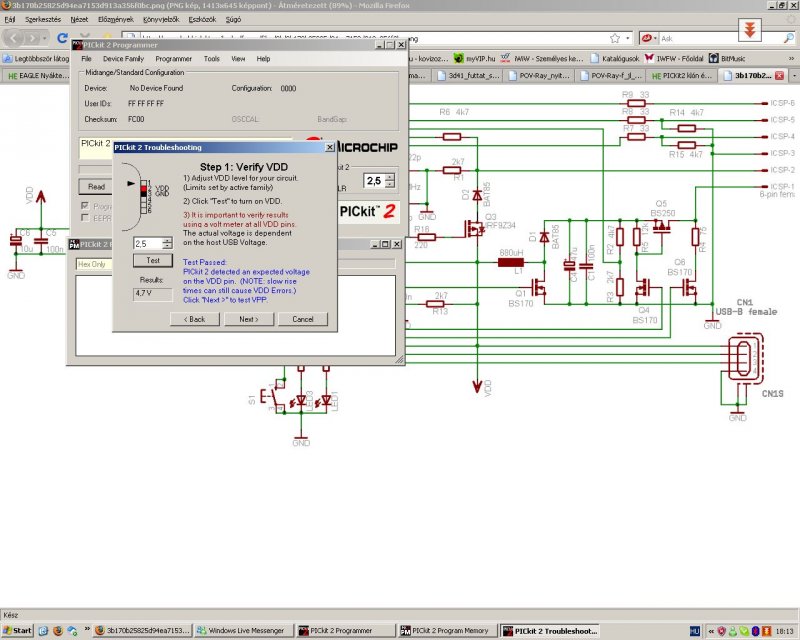 Csináltam egy nem smd-s pic kit klónt. és az lenne ve a gondom hogy amikor rádugom az usb-t akkor a program észre vesz hogy rajta vanmeg minden de ki írja hogy : PICkit 2 VPP voltage level error Check target & retry operation. én ebből szt szűrtem le hogy kevés a programozó feszültség. és először a tekercs re gondoltam mivel nem kaptam csak 400valahány uh-is trekercset gondoltam hogy kicsi ezért tettem bele 1mh-et de ezzel se változott. a nyák az szerintem jó az alkatrészek is jól vannak benne remélem tudtok segíteni