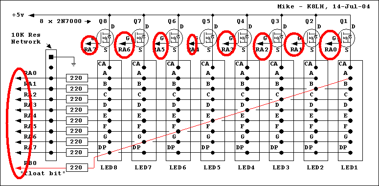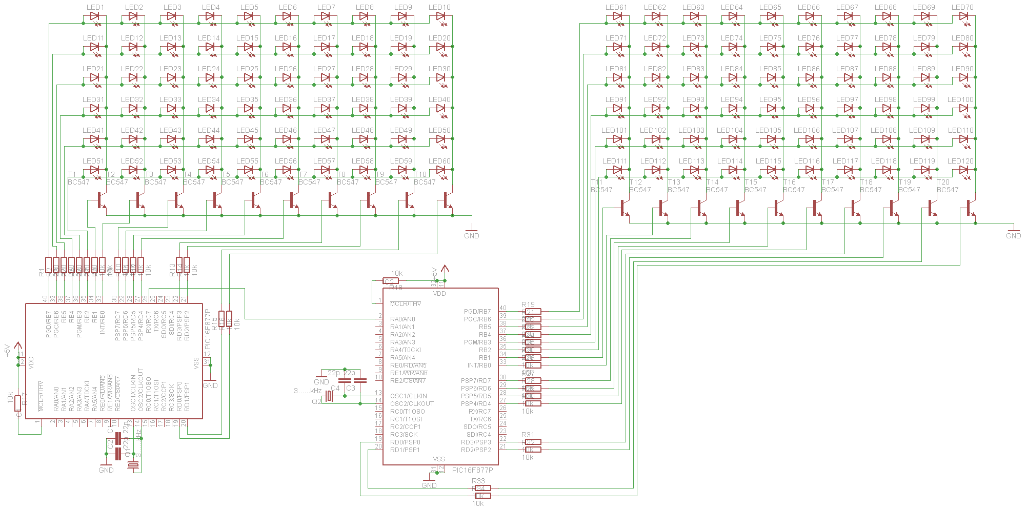 pár oldallal előbb felvetettem egy ötletet, az órával kapcsolatban. És mielött mindenki félreértene mindent, nem 240 led lesz, hanem csak 132, és mátrix módban. Az IC1 RA0-ás lábára megy a léptető, az "órát" meg valami másik, kisebb lábszámú IC vezérelné, az IC2-től (RC7) kapná a jelet. Remélem ennyi infó elég!