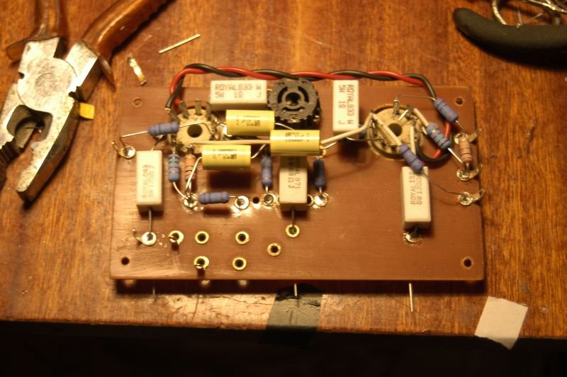 Köszönöm! Úgy van tervezve a panel, hogy katódbiasos, és fix előfeszültség is kialakítható rajta. Most a katódellenállásos megoldás van, egy szimmetrizáló huzaltrimmerrel a két cső között. A másik oldalát nem látod ( ahol a szegecseket fejeztem), azért mondod, hogy jó