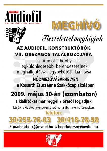AMATÖR AUDIOFIL KONSTRUKTŐRÖK VII. TALÁLKOZÓJA HÓDMEŐVÁSÁRHELYEN MÁJUS 30.-án. TEL:302557603 radio-x@invitel.hu