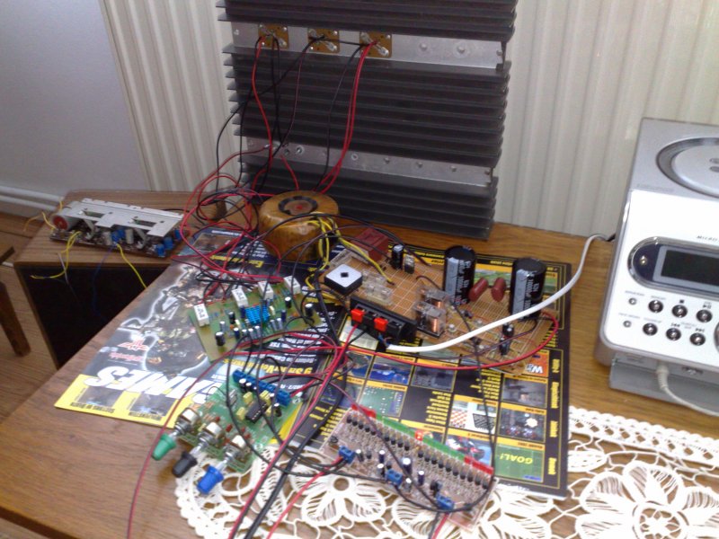 hát az a helyzet, hogy kicsit nagyra sikerült a dolog, meg próbanyákon van a táp meg a hangszóróvédelem, na meg a hűtőborda is szép méretes lett. Sajnos a végtranyók elrendezése nem a legjobb, mert 3 egymás mellett van a negyedik meg a másik oldalt, de csak ilyen hűtőbordát találtam. Ezt is a vatera.hu-ról rendeltem, használt cucc, de 1800ft-ból kijött, a boltba meg 2600ft-ért akartak rámsózni egy olyat, amire csak 2 férne rá... szóval ez nem nagyon fér bele a technics dobozába, de majd valahonnan szerzek neki egy jó nagyot. Tettem 100nf-os kondit a pufferek mellé(egyet-egyet), a jelföldet az alaplapra vittem, szóval gondolom akkor csak a hűtőbordát kellene még a földre kötni hogy ne búgjon. de mondjuk tényleg nagyon minimális, zene közben nem is hallatszik. Biztosítékot tettembele a két ágra, meg a trafó elé is 10A-ek, 250V, de akkor gondolom ki kell majd cseréljem kisebbekre. Van egy kivezérlésjelzőm, azt bekötöttem még a hangstínszabályzó elé, de nem érzékeli a jelet, túl gyenge...valahogy úgy akarnám bekötni, hogyha teszek bele potit, akkor ne kelljen a kivezérlésjelzőt állítani mindig, azért tettem ide a legelejére, de nem jött be...