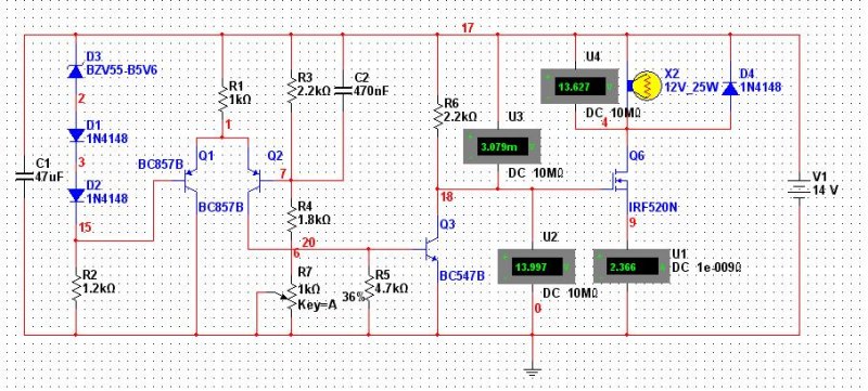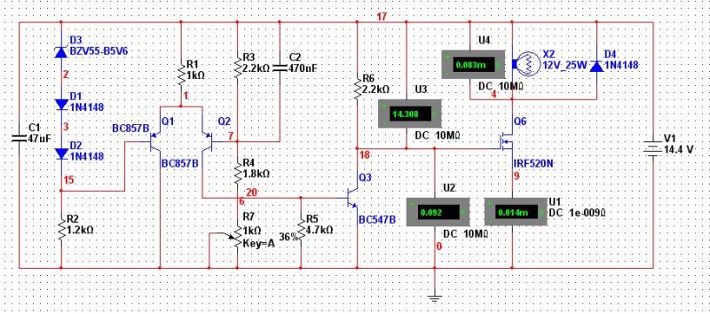 Az lenne a kerdesem, hogy velemenyetek szerint a mellekelt kapcsolas mennyire mukodokepes a valosagban? Ez egy egyszeru feszultsegszabalyzo 12V rendszeru jarmuvekbe (az izzolampa jelkepezi a gerjeszto tekercset). A kerdesem igazabol a beavatkozo szervre (nagyaramu FET) vonatkozik, mert a tobbi resze biztosan jo. Mennyire szerencses igy bekotni a gerjeszto tekercset, hogy a testkabelet szakitom meg? Jelenleg ugy van beallitva, hogy 14,3V-nal kapcsolja le az aramot. A Multisim-ben ugy mukodik ahogyan kell neki, a mellekelt ket kep egy bekapcsolt es egy kikapcsolt allapotot szemleltet. Elore is kosz a valaszokat! Udv!