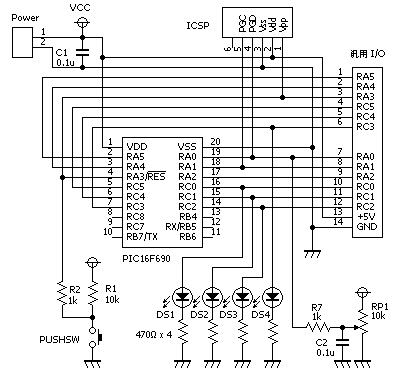 A mellékelt program a PICkit2 Starter Kit egyik demója, ami a PIC16F690-nel szerelt Low Pin Count kártyához készült.