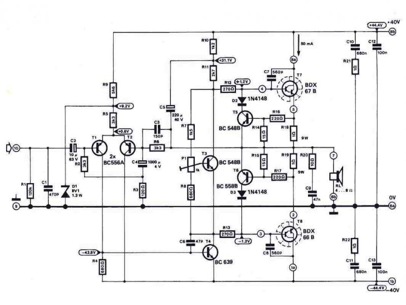 Z diódával stabilizált diff.er. bemeneti fokozata van. A meghajtó középső fokozat is szokásos. A nagyobb teljesítmény miatt a TIP tranzisztorok párhuzamosan vannak kapcsolva. Így első ránézésre probléma mentes jó erősítőnek tünik, de a puding próbája az evés. Nézz utána a TIP végtranzisztorok sima tranzisztorok vagy darlingtonok! Ha ez utóbbiak akkor vigyázni kell az élesztéssel mert könnyen tönkre mehetnek!