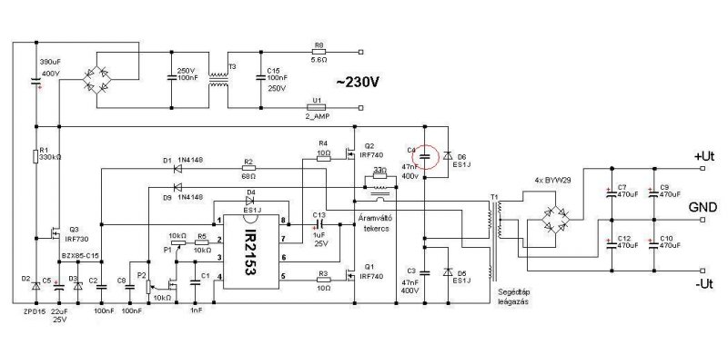 A szakértőktől szeretnék megkérdezni 1-2 dolgot. Most tesztelgetem a második tápomat, amit E42 N67 magból csináltam.70 - 80 kHz-en szépen működött, a kimenet mindkét oldalát (+/-35V) leteszteltem terheléssel is külön-külön. Elsőre így minden rendben volt, de amikor a 70V -ra kapcsoltam a 8 Ohm-os műterhelést, bekapcsoláskor füstölt majd kb 1 sec múlva eldurrant a C4-es kondi (47n 400V) Ez mitől lehetett? A másik kérdésem: mitől melegedhet az ícé? A D2-n 19,8 a D3-on 15,8V mérhető, az IRF 730 nem melegszik, a segédtáp működik.