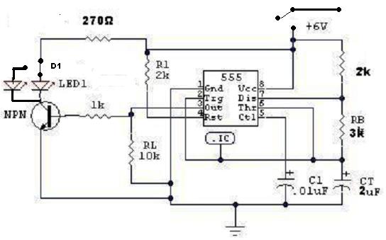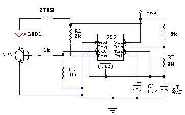 Ezzel a három értékkel (1Kohm, 1Kohm, 0.1uF) 4,8KHz a frekvencia vagyis 4800 Hz !!! Ez olyan gyors, hogy folyamatosnak látni. A másik dolog, a LED előtét ellenállása az NPN tranzisztornál. Sima LED-nél kb. 4-5mA áram fog rajta folyni (erősfényűnél ennyi se, 3mA körül) amitől éppen világít de nem lesz túl erős a fénye. 15-20mA kellene amihez 220-270 ohmos ellenállás kell 6 volton. A többi érték jónak tűnik.