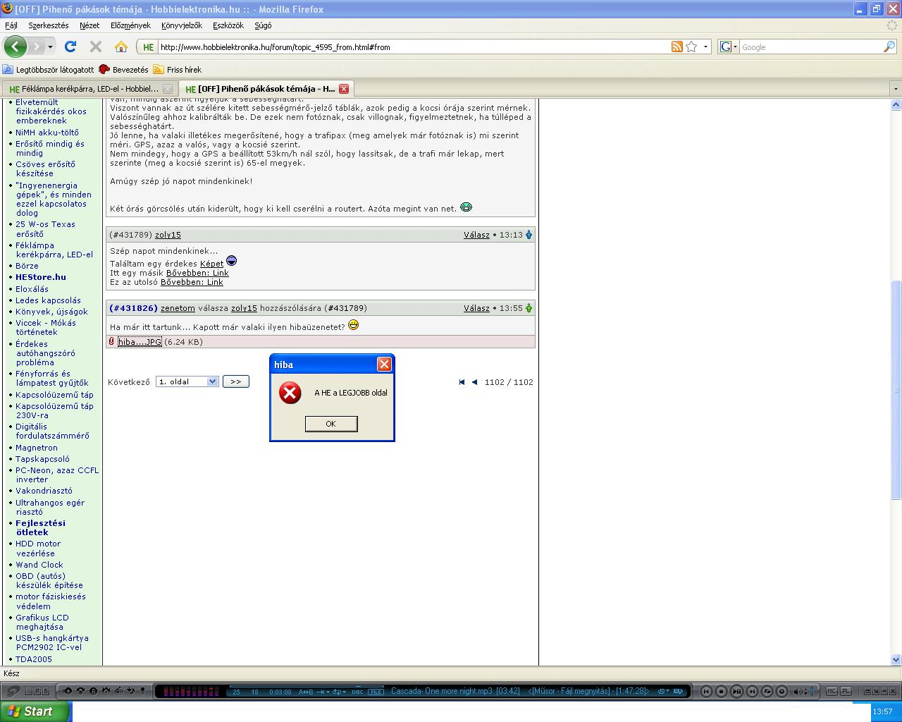 köszi a szívélyes fogadtatást.... Próbálok majd illedelmes fórumozó lenni. Most épp elkezdtem összeforrasztgatni kábelekből, meg a többi alkatrészből a led villogtatót (a kezdő rovat egyszerü áramköreiből) ![]() Ha kész lesz felteszem a ki mit épített rovatba na jó csak hülyültem, egyébként már elkezdtem olvasgatni sok cikket, témát és be is zsongtam tőle mint hülyegyerek az új lego NXT-től, úgyhogy mentem is forrasztani