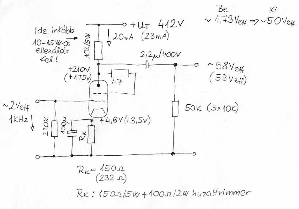 Ez nagyon biztató , 400V feletti tápnál , kipróbálhatnád kicsit nagyobb ellenállással az anódban . A 100u-t a katódban megnövelném , akár 470-1000u-ig is .