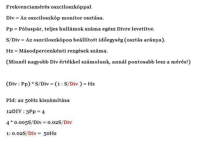 Tehát az utolsó előtti sor eredménye nem 0,02 s/div, hanem az csak szimplán 0,02 s. És ahogyan proli007 írta, ez a periódusidőt adja, tehát mértékegysége a [szekundum] lesz. Ugyanez érvényes lesz az utolsó sorra is, ahova ez az eredmény átkerült. :yes: