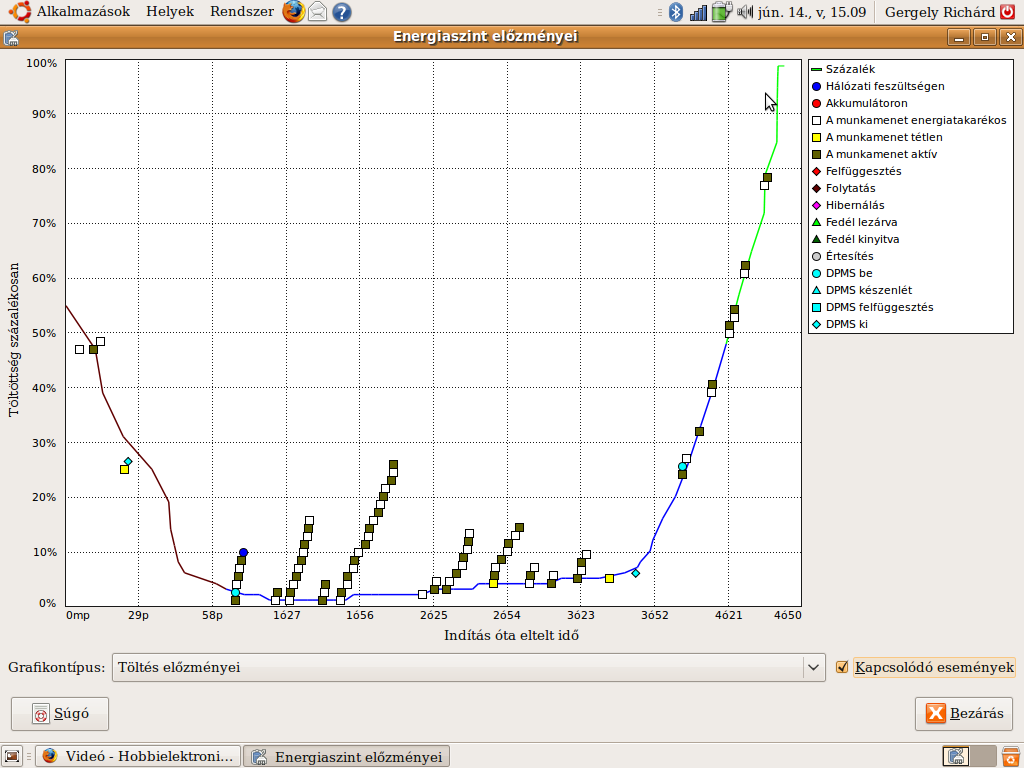 Rég óta hülyén töltődik és merül az aksim. Most hogy Ubuntu van fent, szépen csinál nekem grafikont a töltés és kisütésről. Ezt nézzétek hogy megy. Erre mondjon valaki valami okosat, hogy ez így normális jelenség?