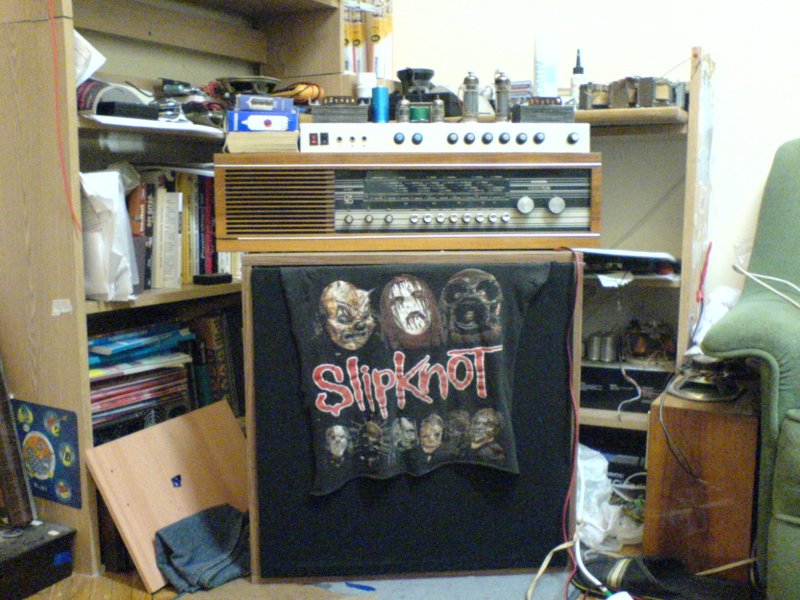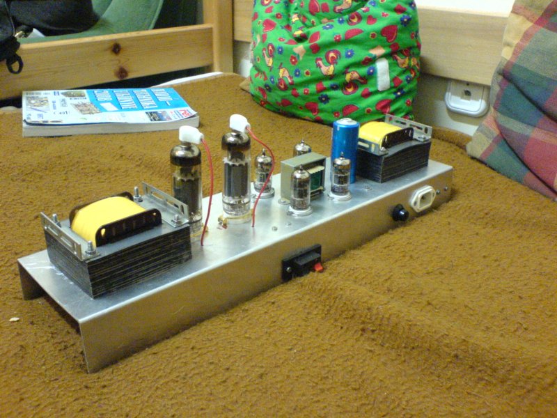 Áhh nem bízom nőszemélyre egyáltalán! Ez egyelőre ott figyel a Videoton Erősítőm tetején . Ha minden igaz jövő héten szerdán szakkörön be is fejezem . Egyelőre ez a Videoton Rádió biztosít 4W-ot 1XECL86-os végfokozatával, és a 4db Videoton HC 20/10-es Gitárhangszóróval hatalmasat szól . Amint kész a másik egyből használatba veszem! Attól meg nem kell félnem, hogy amikor működik valaki belenyúl, mert az a 250V egyenfesz eléggé nevelő, motiváló hatású az anódsapka környékén! (Ez 3XTapasztalat)