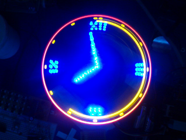 Két apró probléma van a DCF vétellel: - Elfogytak a kivezetések, nincs szabad láb. - A forgó propelleren nem egyszerű a vétel. Az eredeti bázis programban volt egy kis utalás a DCF77 vételére. A vett adatokat az infra LED segítségével vitte volna fel a propellerre. Szerintem nem biztosított, hogy a propeller mindig úgy álljon meg, hogy a fotodióda az infra LED fölött legyen. A beépített RTC elég jól számolja az időt akkor is, amikor nincs táp.