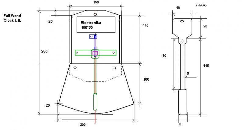 Egy kicsit távol voltam a topiktól, de már újra itthon vagyok. Egy skiccet felrakok az általam épitett falióra méretezéséről. Természetesen nem kötelező igy elkésziteni, egy pusztán elrendezési és technikai megoldás vázlata ez. - Egy rugót sikerült eltörni, ez készült el legelsőnek, az okát még nem tudom. Valószinű, hogy az alaplapi rögzitő elem nem párhuzamos szoritása miatt repedt el. (Hordós a hézag a két szoritó felület egymáshoz illesztésénél.) Erre különösen figyelni kell a jövőben! A repedés közvetlenül a rögzitő elem "tövénél" történt. Két felvételt errő is feltöltök. Ha valamilyen kérdésed van, megpróbálok mindenben segiteni az épitéssel kapcsolatban. Nagyon jó, hogy sikerült rugólemezt beszerezned. Én is fogok postai úton vagy hat darabra valót "rendelni" majd Töled. Szia.