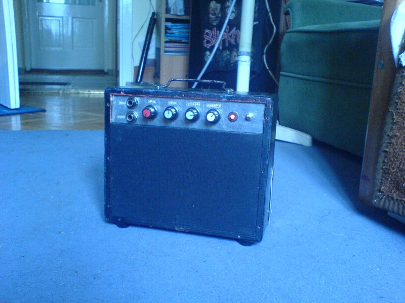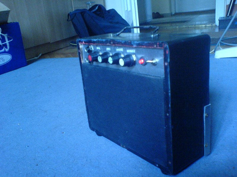 5W-os Gyakorló gitárerősítő. Az egész erősítő 95% Lomtalanításból kukázott és 5% Sajátkészítésű cuccokból épül fel ! A Végerősítő egy Orion Hangpanel TBA800-as IC-vel. A hangszóró egy Videoton TV Ovál 2 kónuszos hangszórója. 6W-os terhelhetőségű. A torzító elektronikát egymagam készítettem 2 BC238B Tranyóból, amik szintén Orion TV-ből lettek bányászva ! Az alumínium vázat a suliban hajtogattam meg. Az egész fakerete eredetileg piros volt, de lefújtam feketére, majd a lomtalanításból kukázott műbőrrel lefedtem.